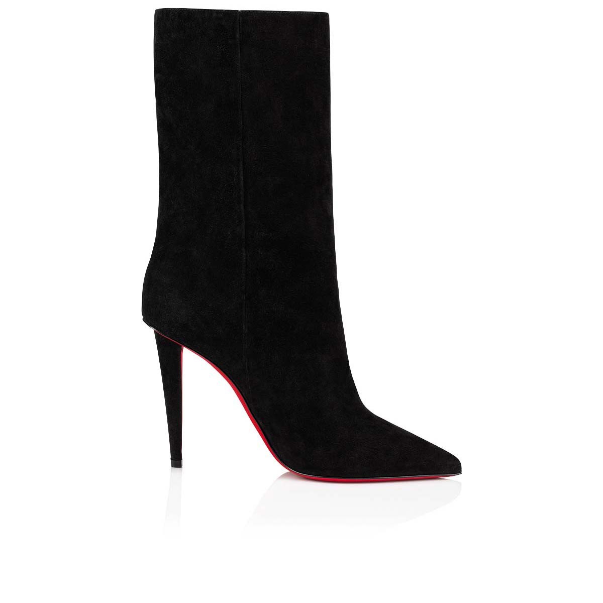 The Astrilarge Booty mid-calf boot embodies the Maison Christian Louboutin’s outstanding, sophisticated style. This model is delicately set on a 100 mm slim architectural heel with a slight overhang, and features decadent black veau velours with a signature Astrid last. The voluptuous lines are dramatically enhanced by a slender pointed toe and opulent crimson sole, exuding a femme fatale chic.