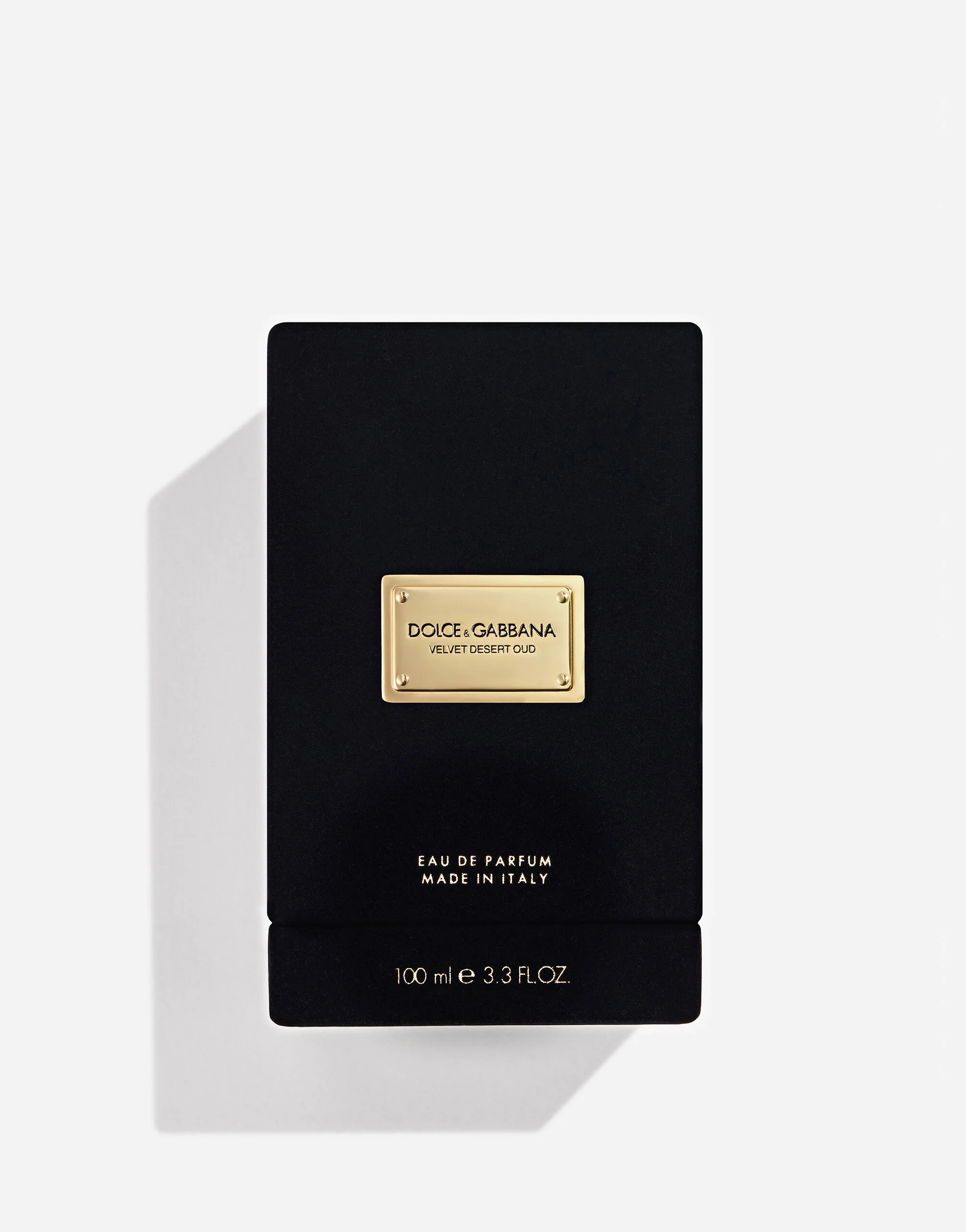 The iconic, weighty glass flacon of the Dolce&Gabbana Velvet Collection is topped with a smoky brown velvet-trimmed stopper with golden accents. The flacon of Dolce&Gabbana Velvet Desert Oud Eau de Parfum is also personalized with an engraved golden plate, and comes encased in a black velvet coffret.